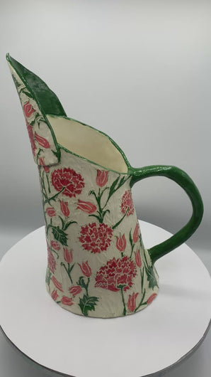 This bright pitcher was inspired by the fabulous wallpaper patterns by William Morris in the mid-1800's. Hand-built and painted in bright corals and green and hand-carved sgraffito in wood-cut fashion, making it highly texturized.This pitcher is functional and holds water, juice or your choice of beverage. All my glazes are non-toxic and food safe and fired to approximately 2000 degrees.