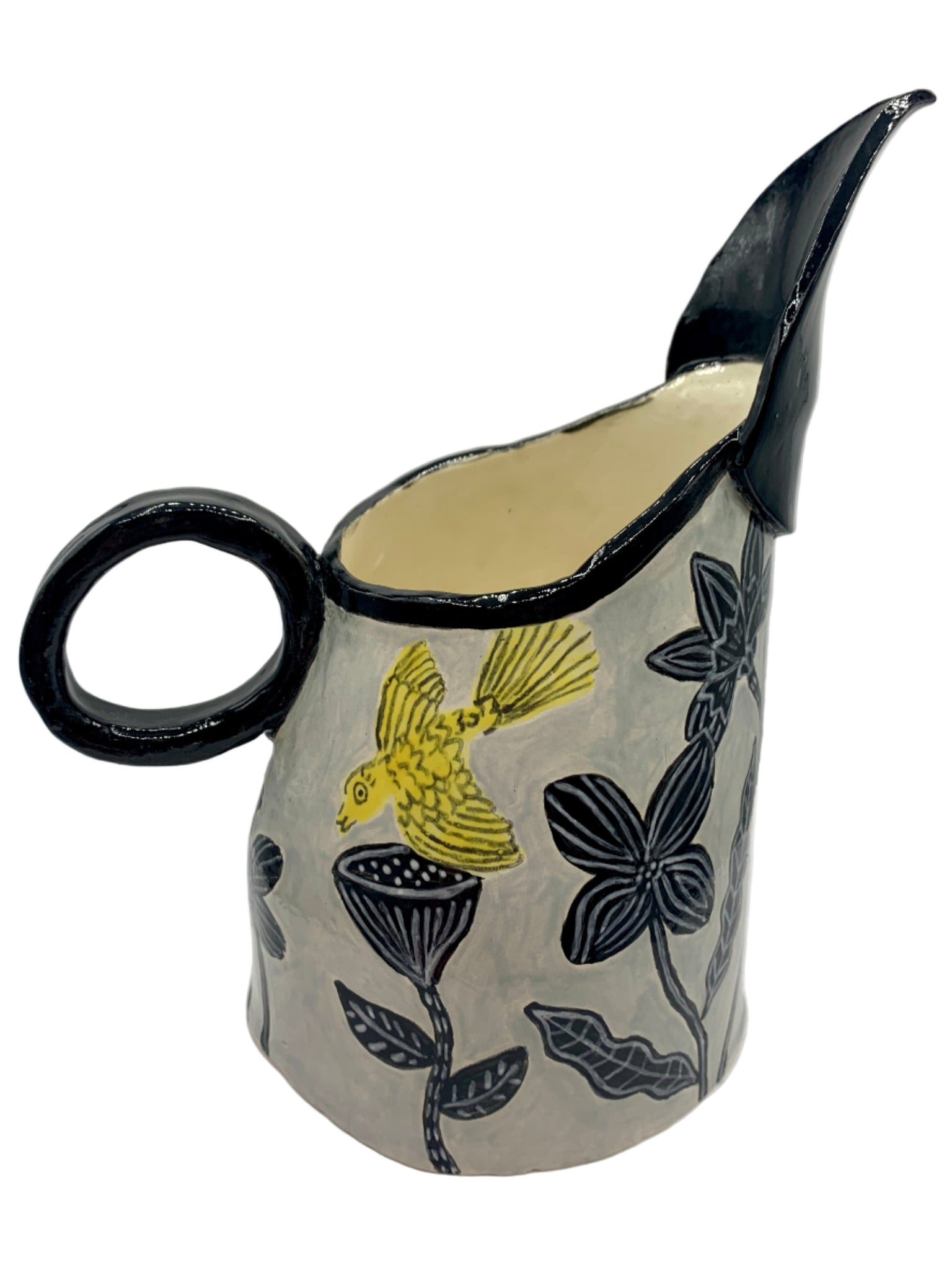 This whimsicle pitcher is hand-painted, featuring black and white flowers with 2 yellow birds.