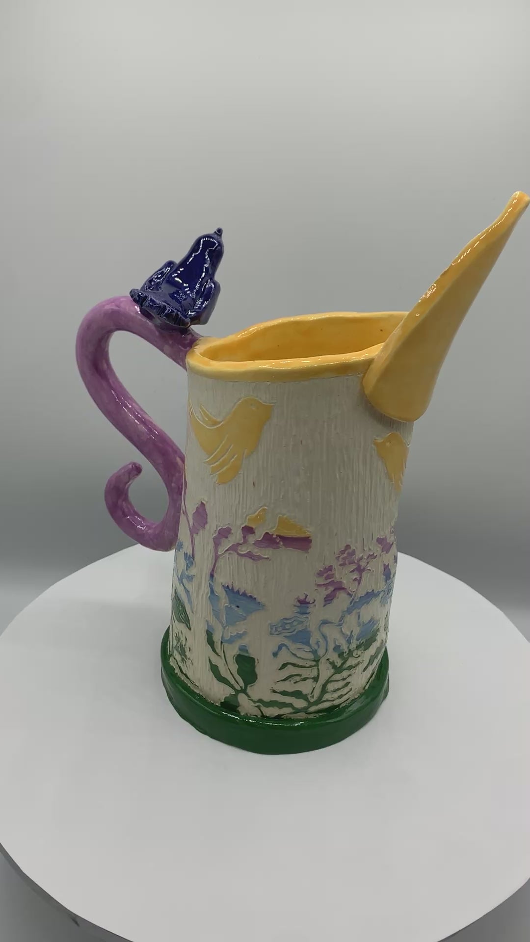 Wildflowers commonly represent freedom, beauty, joy, resilience, and growth as they flourish without cultivation. In springtime California often has "superblooms" after the rains, and people come from all over to see the miracle. This colorful pitcher is hand-built and painted and hand-carved sgraffito in wood-cut fashion, making it highly texturized. This pitcher is functional and holds water, juice or your choice of beverage. All my glazes are non-toxic and food safe and fired to approximately 2000 degrees.
